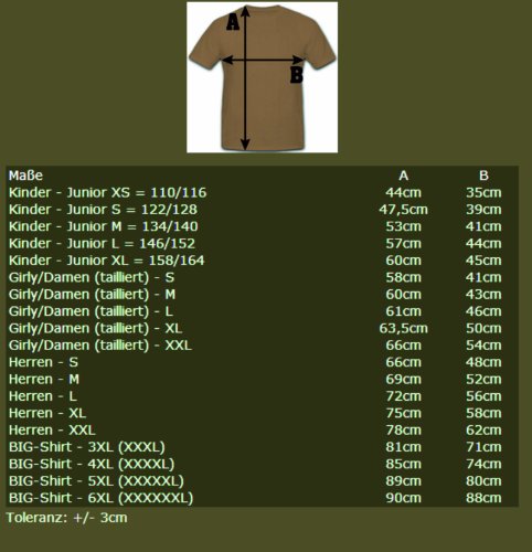 Qualitäts Marken T-Shirt mit dem oben abgebildeten Motiv- hochwertiger Druck made in Germany.- 100% Baumwolle (185gr/qm)- Doppelnähte am Halsausschnitt sowie an den Ärmeln und Saum- Schulter zu Schulter Nackenband- Bitte ermitteln Sie vor Ihrer Bestellung anhand der oben aufgeführten Größen Tabelle Ihre T-Shirt Größe- Dieser Artikel wird erst nach Bestell-Eingang individuell für Sie auf Ihre ausgewählte Größe und Farbe angefertigt und ist somit vom Umtausch ausgeschlossen.- Weitere Motiv Anregungen und Sonderwünsche nehmen wir gerne von Ihnen entgegen.- Weitere Shirt Farben und Größen bekommen Sie auf Anfrage (Damen,Kinder,Übergrößen)- Noch mehr tolle Artikel finden Sie in unserem Amazon Shop.- Sie zahlen nur 1x Versand, egal wie viel Sie kaufen.