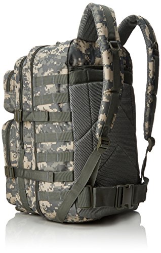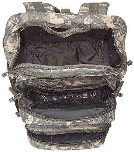 100% Polyester, Polyvinylchlorid beschichtetGesamtvolumen: ca. 36 LiterMaße: 51 x 29 x 28 cmGewicht: ca. 1600 g- gepolsterter Rücken- ergonomisch geformte gepolsterte Schultergurte, ca. 5 cm breit, längenverstellbar- Ösen für zusätzliches Anbringen von Material- längenverstellbarer Bauchgurt mit Schnellverschluss- Tragegriff- 2 große Fächer mit diversen Reißverschluss- und Netzfächern- 1 Fronttasche mit Organizer und zusätzliches Fach mit Reißverschluss- alle Fächer mit 2-Wege Reißverschluss- Volumenkontrolle und Gepäckfixierung mit seitlichen Kompressionsriemen- diverse Molle-Aufnahmepunkte- integriertes Klettfach für einen Hydropack