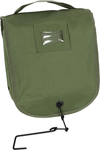 Robuster Bundeswehr Kulturbeutel mit Haken zum Aufhängen mit vielen Unterbringungsmöglichkeiten. An der Rückseite befindet sich ein großes Fach (z.B. für ein Handtuch). Die Tasche verfügt über einen integrierten Kunststoffspiegel, Aufhängehaken, sowie Tragegriff.