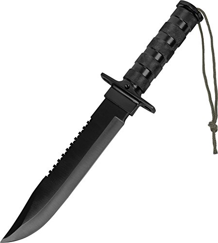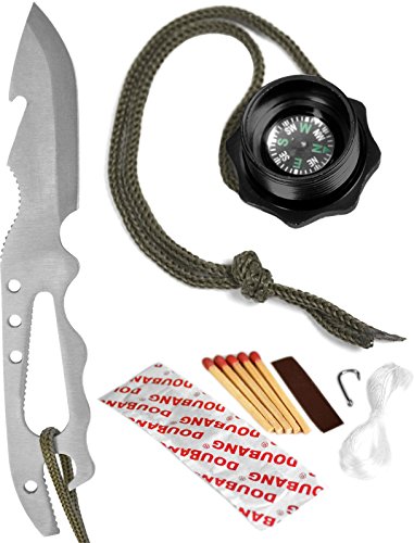 Das Survival Outdoor Messer beinhaltet ein umfangreiches Survival Kit im wasserdichten Aluminiumgriff, welches aus Streichhölzern mit Anzündstreifen, Angel-Set, sowie einem innenliegenden Kompass besteht. Das Messer ist stabil gefertigt, und hat eine rutschhemmende Riffelung am Griff, welche ein Verrutschen verhindert. Ein stabiles Holster mit integrierter Schleuder, ein kleineres Multifunktionsmesser mit Armschlaufe und ein SOS Spiegel ist ebenfalls im Lieferumfang enthalten.· großes Survival Outdoor Messer mit Handschlaufe und wasserdichtem Griff· Survival Kit (Streichhölzer mit Anzündstreifen, Näh-Set, Angel-Set, Kompass)· Holster mit Gürtelschlaufe und integrierter Schleuder und SOS Spiegel· kleineres Multifunktionsmesser mit HandschlaufeKlingenlänge: 20 cmGesamtlänge: 35,5 cm