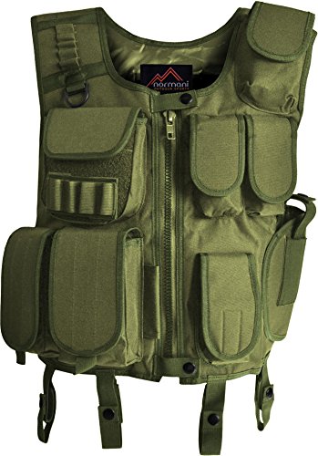 Taktische SWAT Einsatzweste mit vielen praktischen Taschen in verschiedenen Größen. Hier finden Magazine, Handschuhe, Munition oder auch Portomonnaie und Handy ihren Platz. Auf der rechten Seite gibt es außerdem einige elastische „Ösen“, welche ausreichend Platz für Kugelschreiber oder Ähnliches bieten. Der integrierte Pistolenholster ist per Klett verstellbar, sodass fast alle gängigen Kurzwaffen hineinpassen. Alle Taschen auf der Frontseite sind mit Klettverschluss ausgestattet. Die Taktische Weste bietet viele Einstellungsmöglichkeiten (zum Beispiel die korsettartige Schnürung an beiden Seiten (links & rechts) oder die ebenfalls per Klett stufenlos verstellbaren Schulterriemen, wodurch optimaler Sitz und dadurch guter Tragekomfort gewährleistet wird).