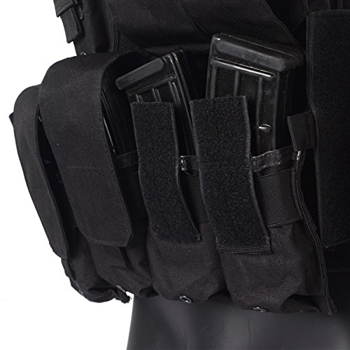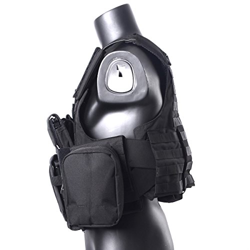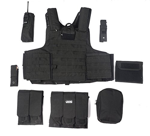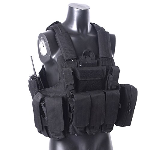 Produktbeschreibung Das ist eine gut ausgebaute taktische Weste. Entworfen, um allot von Missbrauch zu nehmen. Hergestellt aus 1000D hochdichtem Nylon. Full MOLLE Front, Rücken und Seiten. Diese Weste kommt mit 1 Dreifach-Magazintasche M4 / M16, 1 Doppel-Magazintasche M4 / M16, 1 Kartentasche, 2 Taschenlampe / Pistole Clip Magazin, 1 Medizintasche und 1 Funkbeutel. Passend für: Chest 41 '' bis 48 '' / Höhe 5'7 '' bis 6'5 ''. Diese Weste ist mit einem einzigen Punkt Zugkabel Schnellverschlusssystem für Notentfernung ausgestattet und bietet auch vorne und hinten Schleppriemen / Griffe Eigenschaften: – Hochleistungs-, abrieb- und wasserdichtes 800D Denier Nylon Außenaufbau – 1 „Mil. Spec. Gurtbandriemen für die Montage von MOLLE Beuteln – Abnehmbare Schulterpolster – Vollständig einstellbar für Höhe und Umfang – Airsoft Plate installiert für besseren Schutz – Schnellwechselkabel – Sonderkraftbelastungsversion – Alle Beutel auf dem Foto sind inklusive
